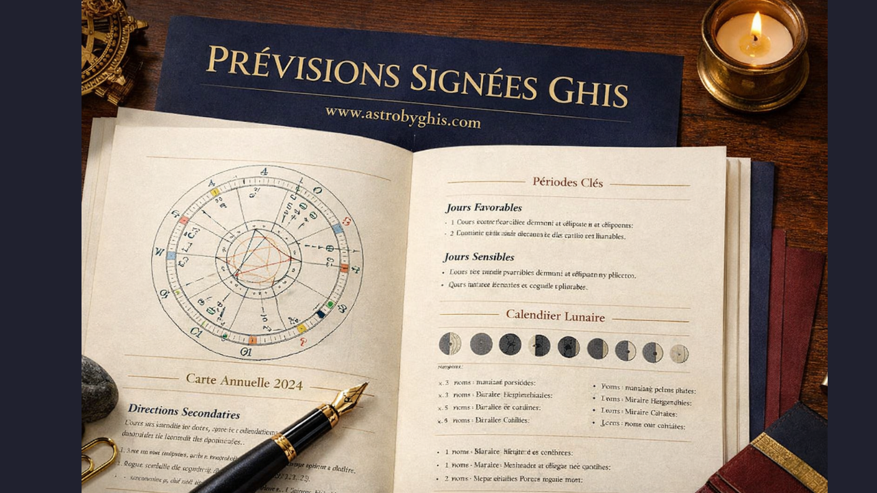 Document astrologique annuel personnalisé, entièrement rédigé par moi. Inclut l’analyse des transits, directions primaires et secondaires, thème progressé, ainsi qu’une synthèse structuré des périodes clés de l’année. Un calendrier astrologique précis vous est remis : jours porteurs, jours sensibles, cycles lunaires et révolutions lunaires intégrées. Aucun échange oral ici. C’est un travail technique, rigoureux et archivable. Livraison sous 7 jours lors des ouvertures.